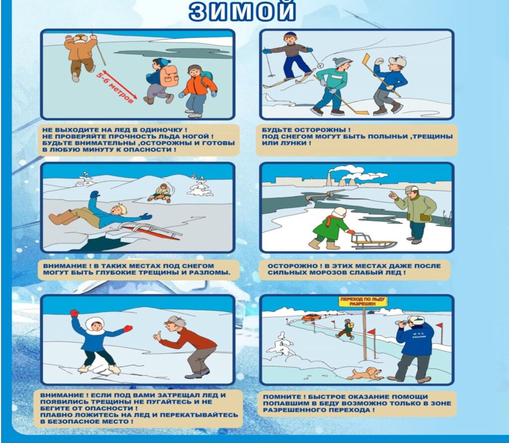 | На лед можно выходить, если он имеет зеленоватый или синеватый оттенок, а толщина его не менее 7 сантиметров. Желтый или матовый лед ненадежен. Если есть проложенная тропа, лучше идти по ней. Будьте осторожны на крутом и скользком берегу, чтобы не скатиться на лед, который может быть тонким и проломиться. |